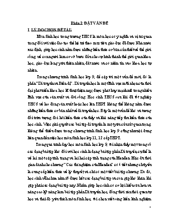 Trong chương trình Sinh học lớp 9 có đưa vào các kiến thức về Di truyền. Đây là phần kiến thức khó, ngoài việc phải nắm được các kiến thức cơ bản thì học sinh cần phải vận dụng lý thuyết vào giải các dạng bài tập liên quan, như vậy mới có thể củng cố và khắc sâu kiến thức. Mặt khác đây cũng chính là các dạng toán cơ bản để giúp học sinh có đủ cơ sở để lên học cấp THPT. Chính vì thế, tôi làm đề tài này nhằm giúp giáo viên có thêm thông tin về phương pháp giải các dạng toán cơ bản trong chương trình Sinh học ở bậc THCS để vận dụng vào việc dạy trên lớp, dạy học tự chọn cũng như dạy bồi dưỡng học sinh giỏi trong các nhà trường.